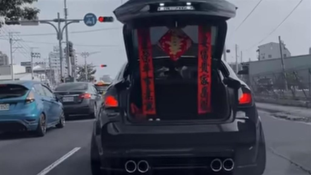 日前一段影片在網路上瘋傳,內容為一輛黑色名車突然右切超車,並在停紅燈時,突然打開後車廂,裡面還藏著一副春聯,超新穎的拜年方式也讓許多人驚呼連連。